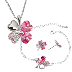 {"id":1802028187693,"title":"Four Leaf Clover Pendant Necklace, Earrings and Bracelet Set w\/ Swarovski Crystals | Rhodium Plated | Dahlia","handle":"four-leaf-clover-swarovski-crystal-pendant-necklace-earrings-bracelet-set","description":"\u003cul\u003e\n\u003cli\u003eDESIGN: 4 heart shaped clover leaves that shows the wearer you wish them good luck with all your heart\u003c\/li\u003e\n\u003cli\u003eSet with 8 authentic heart shaped Swarovski Elements Crystals and small Czech rhinestones\u003c\/li\u003e\n\u003cli\u003eAvailable in various color: Blue, Green and Pink\u003c\/li\u003e\n\u003cli\u003eRhodium Plated with intricate high polish which creates glamorous reflections and adds a luxurious look\u003c\/li\u003e\n\u003cli\u003eRISK FREE: Covers all defects and damages with no-question-asked return policy\u003c\/li\u003e\n\u003c\/ul\u003e\u003c!-- split --\u003e\u003cp\u003e\u003c\/p\u003e","published_at":"2019-05-02T12:44:24-04:00","created_at":"2019-05-02T12:44:31-04:00","vendor":"Dahlia","type":"Jewelry Set","tags":["908257.9937","Category_Jewelry Sets","Price_$50 to $100","Stone_Swarovski Elements Crystal","Swarovski"],"price":6495,"price_min":6495,"price_max":6495,"available":true,"price_varies":false,"compare_at_price":11095,"compare_at_price_min":11095,"compare_at_price_max":11095,"compare_at_price_varies":false,"variants":[{"id":15216769761325,"title":"Green","option1":"Green","option2":null,"option3":null,"sku":"908257.9937GR","requires_shipping":true,"taxable":true,"featured_image":{"id":11767074947117,"product_id":1802028187693,"position":1,"created_at":"2019-06-17T16:09:11-04:00","updated_at":"2021-02-03T18:52:48-05:00","alt":"Four Leaf Clover Swarovski Crystal Elements Pendant Necklace, Earrings and Bracelet Set Rhodium Plated | Dahlia","width":1280,"height":1280,"src":"\/\/www.dahliany.com\/cdn\/shop\/products\/908257.9937GR_main.jpg?v=1612396368","variant_ids":[15216769761325]},"available":true,"name":"Four Leaf Clover Pendant Necklace, Earrings and Bracelet Set w\/ Swarovski Crystals | Rhodium Plated | Dahlia - Green","public_title":"Green","options":["Green"],"price":6495,"weight":90,"compare_at_price":11095,"inventory_management":"shopify","barcode":null,"featured_media":{"alt":"Four Leaf Clover Swarovski Crystal Elements Pendant Necklace, Earrings and Bracelet Set Rhodium Plated | Dahlia","id":3095144071213,"position":1,"preview_image":{"aspect_ratio":1.0,"height":1280,"width":1280,"src":"\/\/www.dahliany.com\/cdn\/shop\/products\/908257.9937GR_main.jpg?v=1612396368"}},"requires_selling_plan":false,"selling_plan_allocations":[]},{"id":15216769794093,"title":"Blue","option1":"Blue","option2":null,"option3":null,"sku":"908257.9937BL","requires_shipping":true,"taxable":true,"featured_image":{"id":11767075110957,"product_id":1802028187693,"position":6,"created_at":"2019-06-17T16:09:11-04:00","updated_at":"2021-02-03T18:52:48-05:00","alt":"Four Leaf Clover Swarovski Crystal Elements Pendant Necklace, Earrings and Bracelet Set Rhodium Plated | Dahlia","width":1280,"height":1280,"src":"\/\/www.dahliany.com\/cdn\/shop\/products\/908257.9937BL_main.jpg?v=1612396368","variant_ids":[15216769794093]},"available":true,"name":"Four Leaf Clover Pendant Necklace, Earrings and Bracelet Set w\/ Swarovski Crystals | Rhodium Plated | Dahlia - Blue","public_title":"Blue","options":["Blue"],"price":6495,"weight":90,"compare_at_price":11095,"inventory_management":"shopify","barcode":null,"featured_media":{"alt":"Four Leaf Clover Swarovski Crystal Elements Pendant Necklace, Earrings and Bracelet Set Rhodium Plated | Dahlia","id":3095144235053,"position":6,"preview_image":{"aspect_ratio":1.0,"height":1280,"width":1280,"src":"\/\/www.dahliany.com\/cdn\/shop\/products\/908257.9937BL_main.jpg?v=1612396368"}},"requires_selling_plan":false,"selling_plan_allocations":[]},{"id":15216769826861,"title":"Pink","option1":"Pink","option2":null,"option3":null,"sku":"908257.9937PK","requires_shipping":true,"taxable":true,"featured_image":{"id":11767075242029,"product_id":1802028187693,"position":10,"created_at":"2019-06-17T16:09:11-04:00","updated_at":"2021-02-03T18:52:48-05:00","alt":"Four Leaf Clover Swarovski Crystal Elements Pendant Necklace, Earrings and Bracelet Set Rhodium Plated | Dahlia","width":1280,"height":1280,"src":"\/\/www.dahliany.com\/cdn\/shop\/products\/908257.9937PK_main.jpg?v=1612396368","variant_ids":[15216769826861]},"available":true,"name":"Four Leaf Clover Pendant Necklace, Earrings and Bracelet Set w\/ Swarovski Crystals | Rhodium Plated | Dahlia - Pink","public_title":"Pink","options":["Pink"],"price":6495,"weight":90,"compare_at_price":11095,"inventory_management":"shopify","barcode":null,"featured_media":{"alt":"Four Leaf Clover Swarovski Crystal Elements Pendant Necklace, Earrings and Bracelet Set Rhodium Plated | Dahlia","id":3095144366125,"position":10,"preview_image":{"aspect_ratio":1.0,"height":1280,"width":1280,"src":"\/\/www.dahliany.com\/cdn\/shop\/products\/908257.9937PK_main.jpg?v=1612396368"}},"requires_selling_plan":false,"selling_plan_allocations":[]}],"images":["\/\/www.dahliany.com\/cdn\/shop\/products\/908257.9937GR_main.jpg?v=1612396368","\/\/www.dahliany.com\/cdn\/shop\/products\/208257.9937GR_A_80963395-afc7-46d4-af10-587d7494bd8c.jpg?v=1612396368","\/\/www.dahliany.com\/cdn\/shop\/products\/208257.9937GR_B_e12262d2-9c34-4a9e-a8cc-3abbd9825f87.jpg?v=1612396368","\/\/www.dahliany.com\/cdn\/shop\/products\/208257.9937GR_D.jpg?v=1612396368","\/\/www.dahliany.com\/cdn\/shop\/products\/408257.9937GR_B.jpg?v=1612396368","\/\/www.dahliany.com\/cdn\/shop\/products\/908257.9937BL_main.jpg?v=1612396368","\/\/www.dahliany.com\/cdn\/shop\/products\/208257.9937BL_A_1cf5b490-8013-4f64-b505-aa6f824d8072.jpg?v=1612396368","\/\/www.dahliany.com\/cdn\/shop\/products\/208257.9937BL_B_8a3f3fb9-f360-4195-8dee-e0980097da16.jpg?v=1612396368","\/\/www.dahliany.com\/cdn\/shop\/products\/308257.9937BL_B_a8f1419b-9655-4bb6-b4fd-fedfd1a96a5e.jpg?v=1612396368","\/\/www.dahliany.com\/cdn