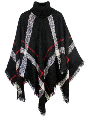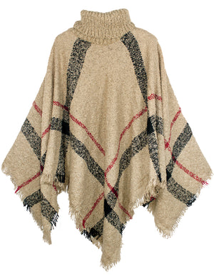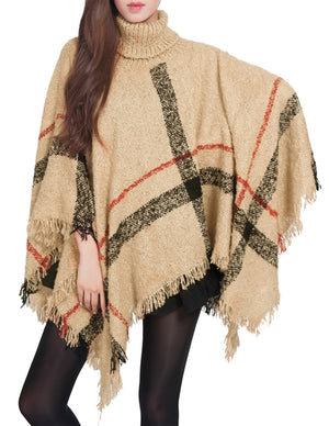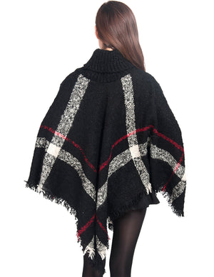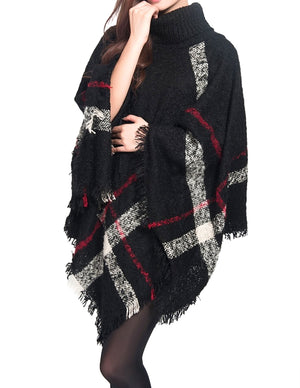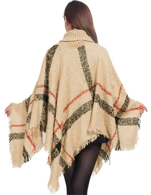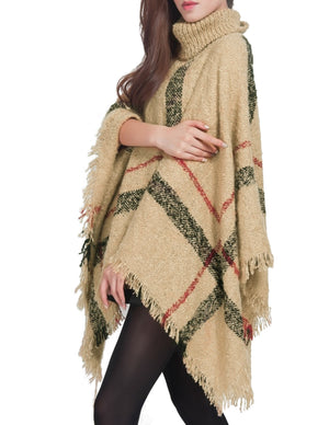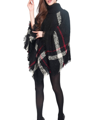 Knitted Poncho Coarse Plaid Turtleneck Cape