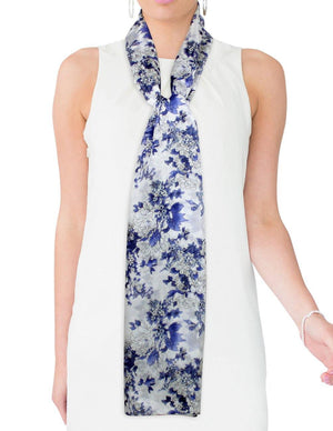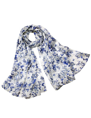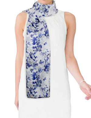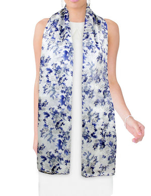 Blue White Floral Print Lightweight Sheer Long Silk Scarf - White
