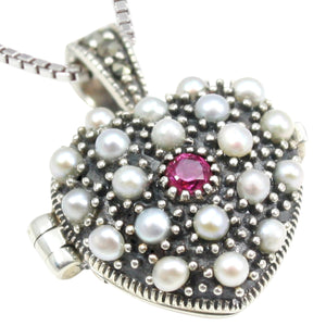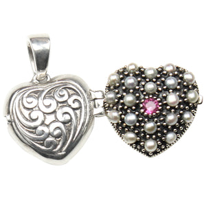 Heart Shaped Locket Seed Pearl Sterling Silver Pendant Necklace - Dahlia Vintage Collection